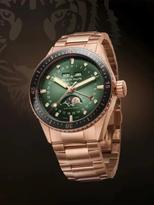 The limited-edition Tiger Edition timepiece, a true tribute to timeless artistry. This exclusive piece is available solely through Time Avenue. This special edition Fifty Fathoms timepiece features an unidirectional satin-brushed 18ct red gold bezel with ceramic insert and Ceragold hour-markers∙ secured movement. The watch features a Complete Calendar, moon phases, and a self-winding movement all beautifully compressed in a sunburst green dial with subtly graduated coloring.
