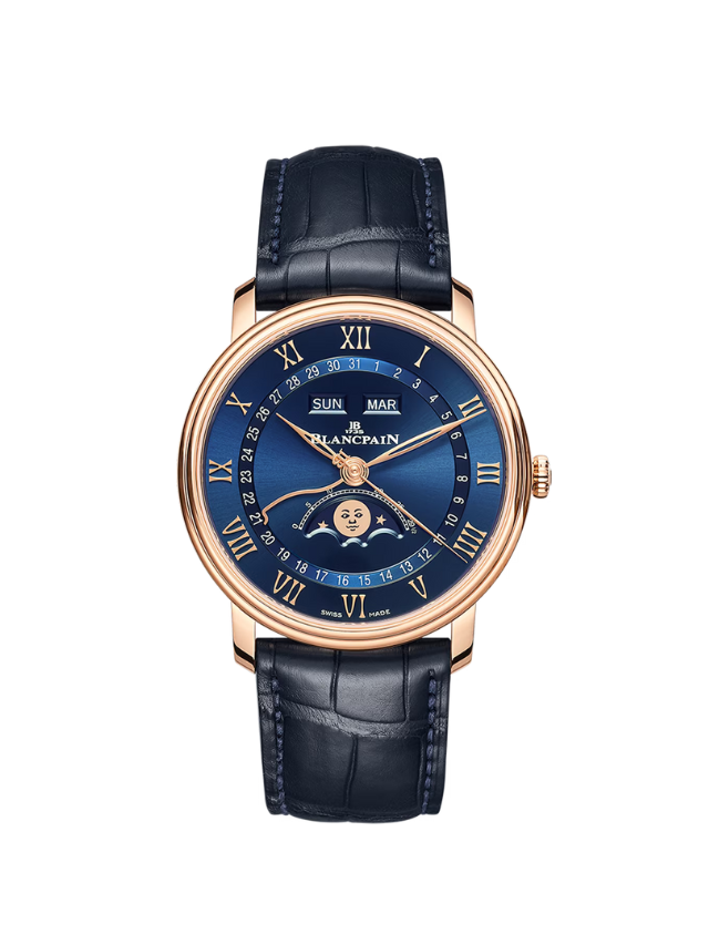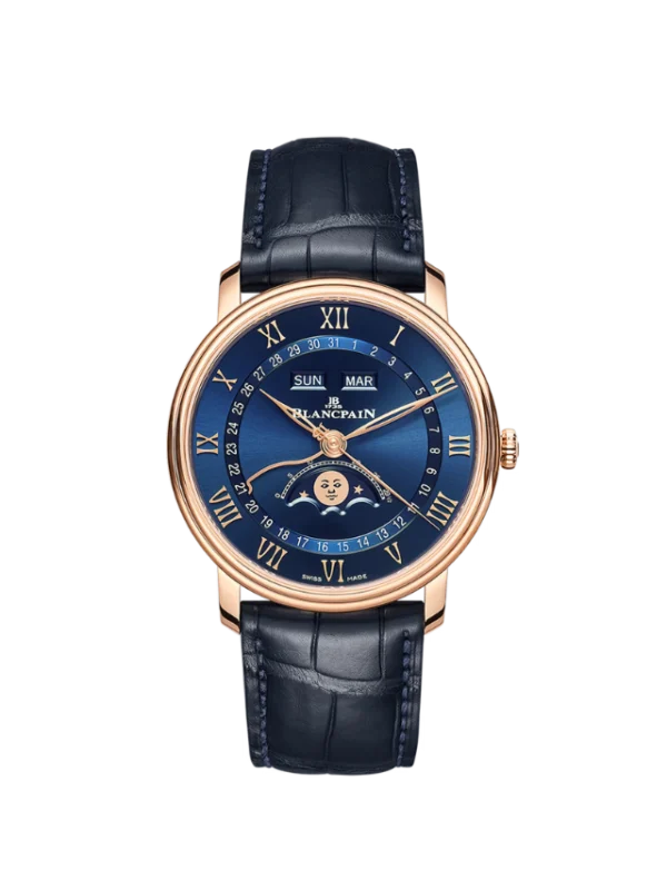 Blancpain Villeret Quantième Complet 6654-3640-55B – A masterpiece of classic Swiss watchmaking, this refined timepiece features a beautifully balanced 40 mm stainless-steel case paired with a rich brown-gold dial that elegantly displays the day, date, month, and moon phase in a harmonious layout. Driven by Blancpain’s precision automatic movement with a strong power reserve and subtle sophistication, it combines functional complexity with timeless aesthetics. Matched with a luxurious brown alligator leather strap, the Villeret Quantième Complet is perfect for those who appreciate traditional craftsmanship, understated luxury, and finely executed complications in a distinguished dress watch.