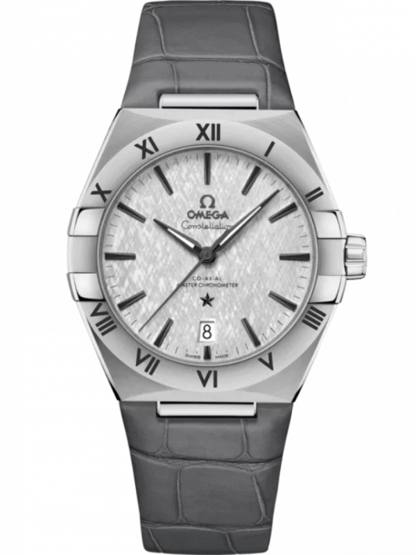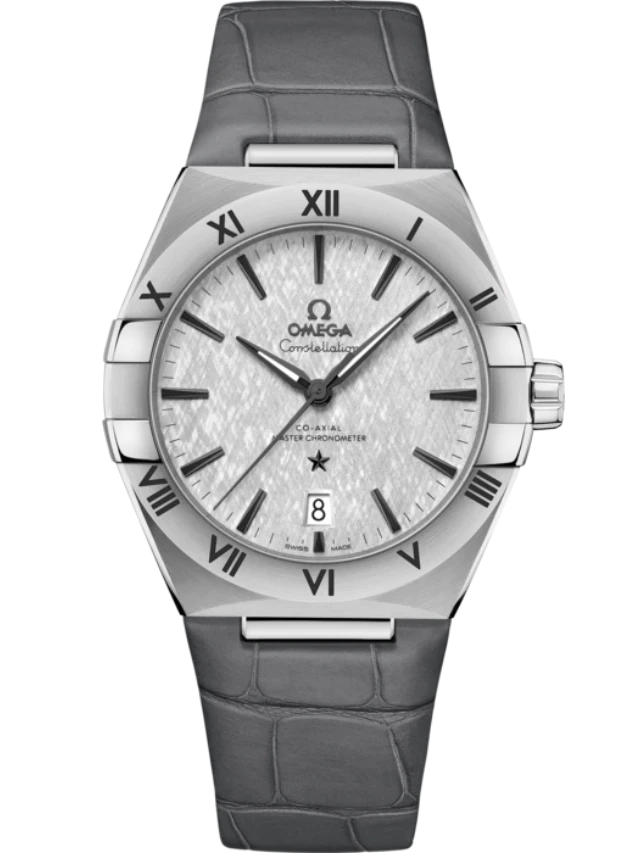This 39 mm stainless steel model features a bezel with blackened Roman numerals, a silk-embossed rhodium-grey dial and a date window at the 6 o’clock position. The hands, OMEGA logo, Constellation star and indexes are all blackened.
