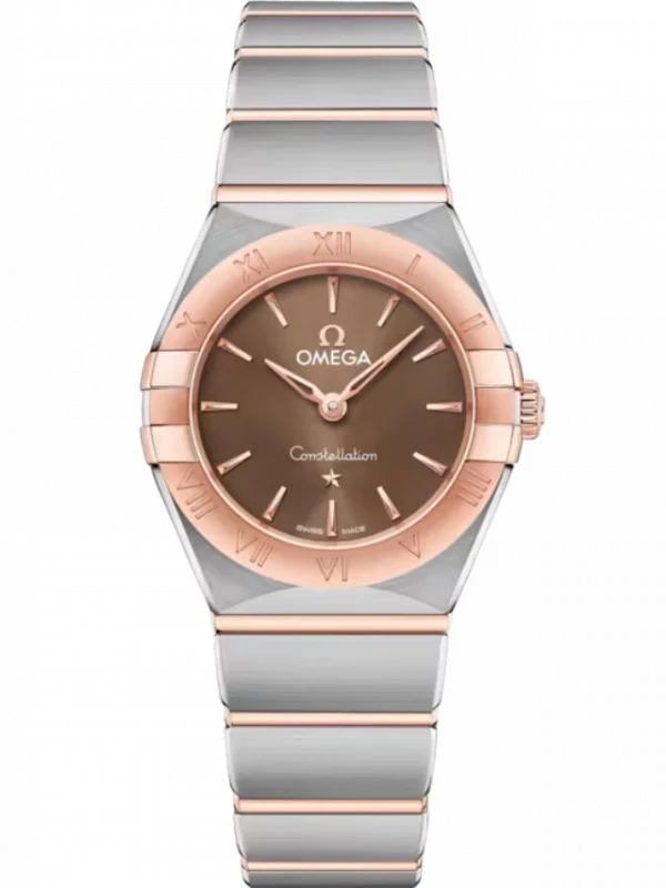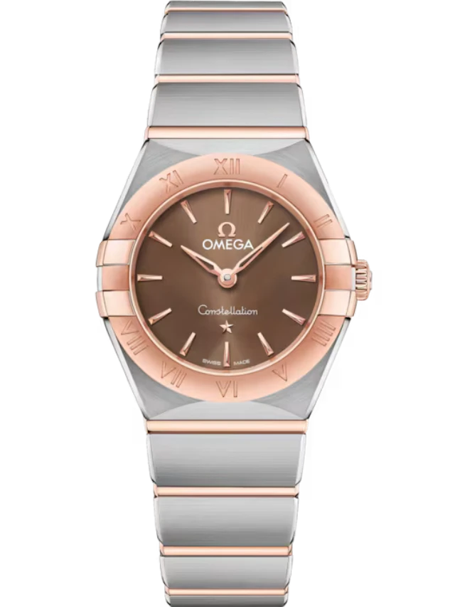 This 25 mm 18K Sedna™ gold and stainless steel model features a bezel engraved with Roman numerals, sun-brushed brown dial and scratch-resistant saphire crystal. The hands, OMEGA logo, Constellation star and indexes are also in 18K Sedna™ gold.