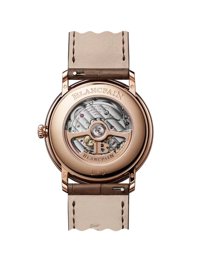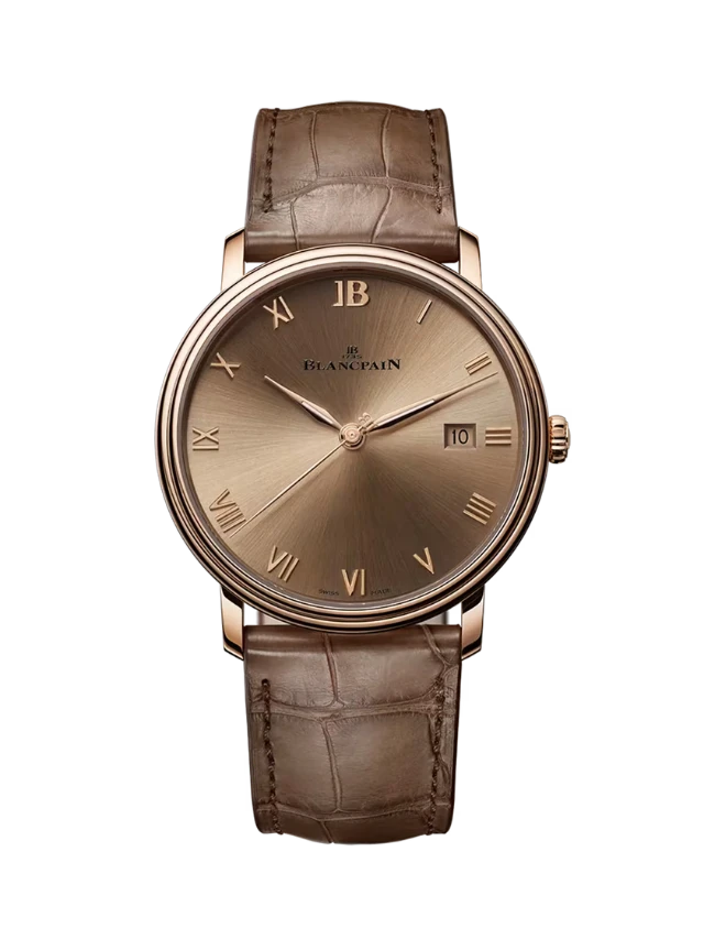 The Blancpain Villeret Extraplate 6651N-3646-55B features a refined 40 mm 18K red gold case with an ultra-slim profile of just 8.7 mm, embodying classic dress watch elegance. It showcases a warm brown sunburst dial with a clean, minimalist layout and a discreet date display, complemented by slim hands and refined hour markers for a balanced aesthetic. Powered by the in-house automatic calibre 1151, the watch delivers an impressive 100-hour power reserve and incorporates a silicon balance spring for enhanced precision and durability. A sapphire crystal case back reveals the finely finished movement, while the timepiece is completed with a brown alligator leather strap, making it a timeless expression of Blancpain’s heritage, craftsmanship, and understated luxury.