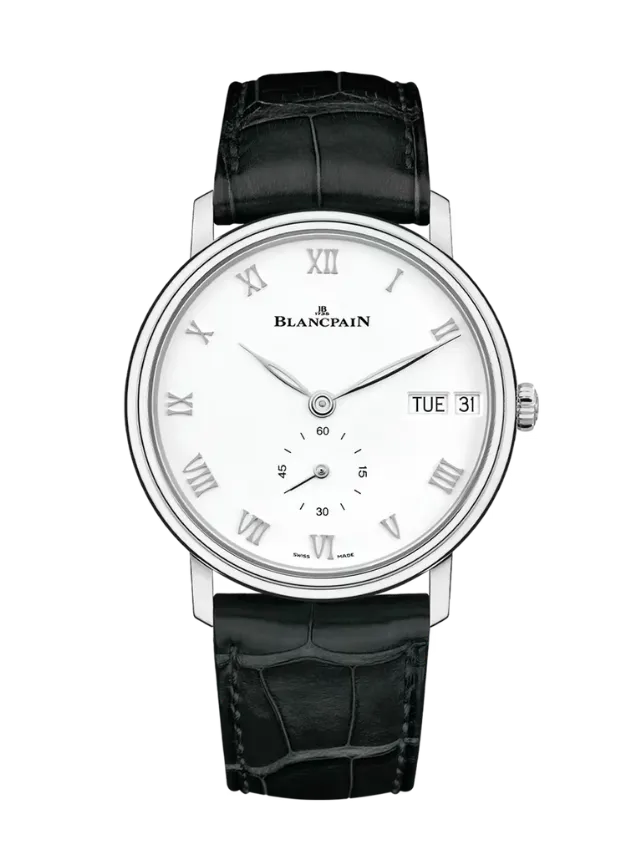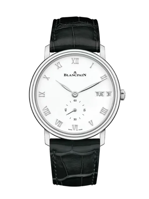Blancpain Villeret Jour Date 6652 1127 55B – A refined embodiment of classic Swiss elegance and premium watchmaking, this distinguished timepiece features a sleek 40.5 mm stainless-steel case with a crisp white dial, day-of-week and date windows at 3 o’clock, and a small seconds subdial for balanced functionality. Powered by Blancpain’s automatic Caliber 1160DD with a 72-hour power reserve, the watch is paired with a luxurious black alligator leather strap and folding clasp for timeless comfort and style. With its understated sophistication and impeccable craftsmanship, the Villeret Jour Date is a superb choice for those who value traditional design and reliable performance in a luxury dress watch.