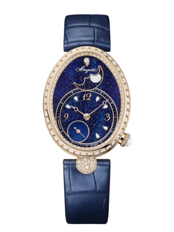 Breguet Reine de Naples Phase de Lune 9935 BH/4Y/964 D0 – A breathtaking fusion of refined elegance and celestial artistry, this luxurious timepiece features a gracefully shaped oval rose gold case with a diamond-set bezel and a sophisticated mother-of-pearl dial showcasing an enchanting moon-phase display. Powered by a precision automatic movement and matched with a rich blue alligator leather strap, the Reine de Naples Phase de Lune embodies timeless sophistication and exquisite Breguet craftsmanship. Perfect for those who appreciate classic design with poetic detail, this watch is a stunning expression of haute-horlogerie elegance.
