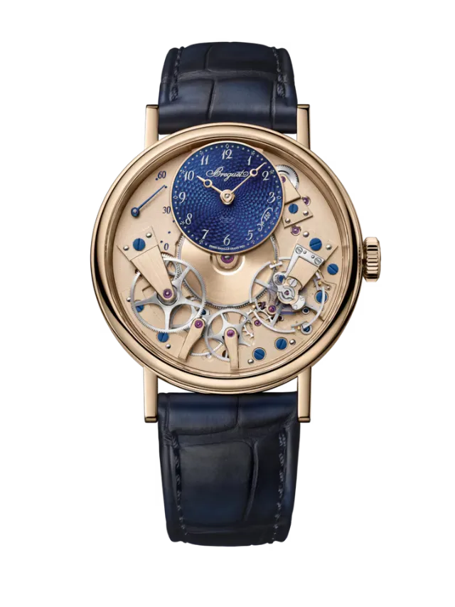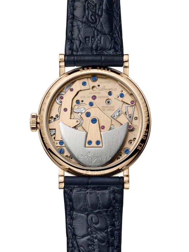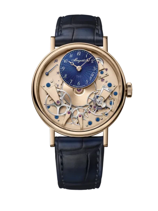 The Breguet Tradition Seconde Rétrograde 7035 (Ref. 7035BH/H2/9V6) showcases a 38 mm 18K rose gold case that frames the signature open-worked Tradition architecture, revealing the finely finished mechanical components from the dial side. The off-centred dial, crafted in white mother-of-pearl, displays elegant Breguet hands and classic numerals, while a retrograde seconds indication adds dynamic visual movement to the design. Powered by a self-winding mechanical movement, this timepiece reflects Breguet’s historic watchmaking heritage with meticulous detailing and balanced symmetry. Completed with a refined leather strap, the Tradition 7035 embodies a sophisticated blend of technical artistry and timeless elegance.