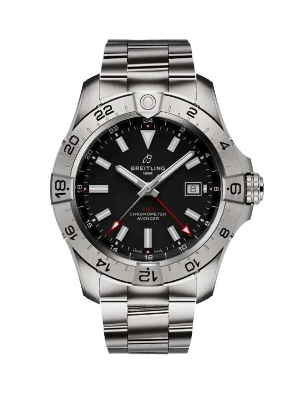 Breitling Avenger Automatic GMT 44 (A32320101B1A1) – Designed for strength and reliability, this robust timepiece features a bold black dial with luminous baton hour markers and distinctive red GMT indicators, allowing clear reading of a second time zone. The solid stainless-steel case is complemented by a matching 24-hour rotating bezel, reinforcing its professional tool-watch character. Fitted with a durable stainless-steel bracelet, the watch offers excellent comfort and everyday versatility, while the date display at 3 o’clock adds practical functionality. Built with Breitling’s chronometer-certified precision, the Avenger GMT is ideal for those who value performance, clarity, and a strong aviation-inspired design.