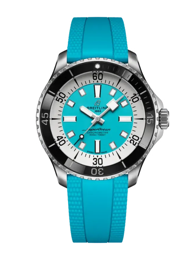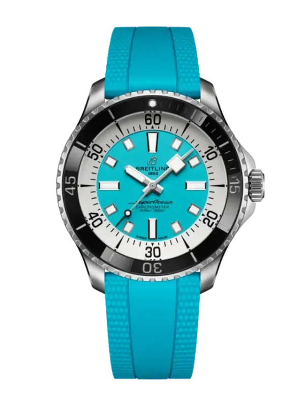 The Breitling Superocean Automatic 44 (Ref. A17376211L2S2) is a bold and high-performance dive watch featuring a 44 mm stainless steel case paired with a striking turquoise dial and matching rubber strap for a sporty, modern look. The dial is designed for maximum legibility with large luminous hour markers and hands coated with Super-LumiNova®, along with a clean time-only display. It is powered by the Breitling Calibre 17 automatic movement, offering reliable precision and a power reserve of approximately 38 hours. Built for serious underwater performance, the watch includes a unidirectional rotating bezel, screw-down crown, scratch-resistant sapphire crystal with anti-reflective coating, and water resistance up to 300 meters, making it a perfect combination of durability, functionality, and contemporary style.