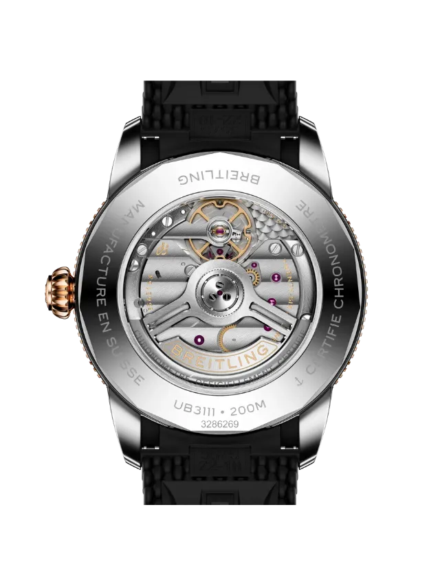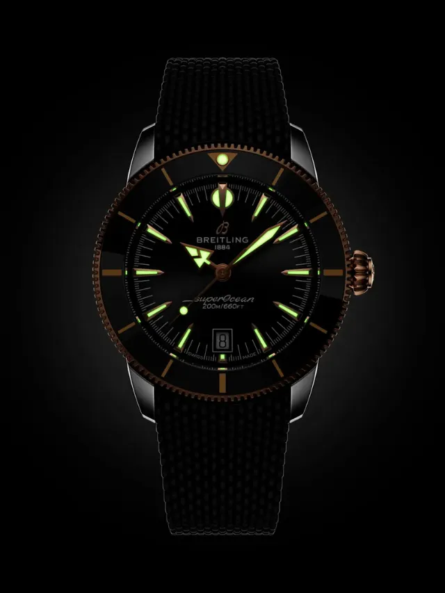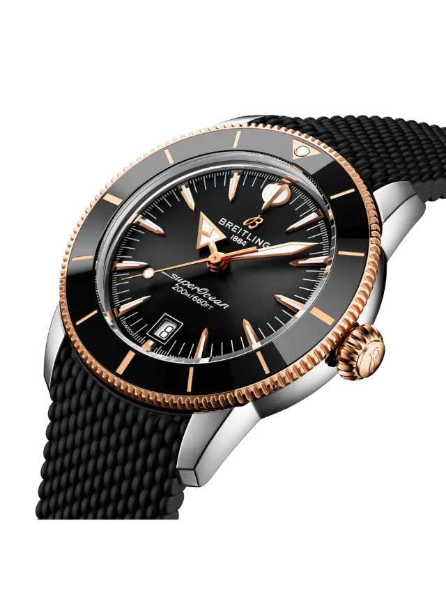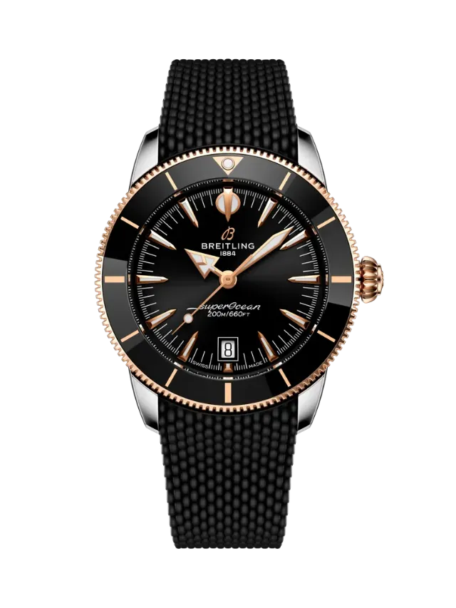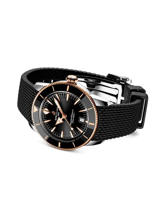 Breitling Superocean Heritage B31 Automatic 42 (UB3111241B1S1) – This elegant yet sporty timepiece features a striking black dial with applied rose-gold-tone hour markers and hands, offering excellent contrast and refined legibility. The unidirectional black bezel with a rose-gold-tone edge enhances its bold maritime character, while the robust case showcases a sophisticated two-tone finish. Paired with a durable and comfortable black rubber strap, the watch delivers a modern, versatile look suitable for both everyday wear and active lifestyles. A date display at 6 o’clock adds practical functionality, making this Superocean Heritage a perfect blend of classic design and contemporary performance.