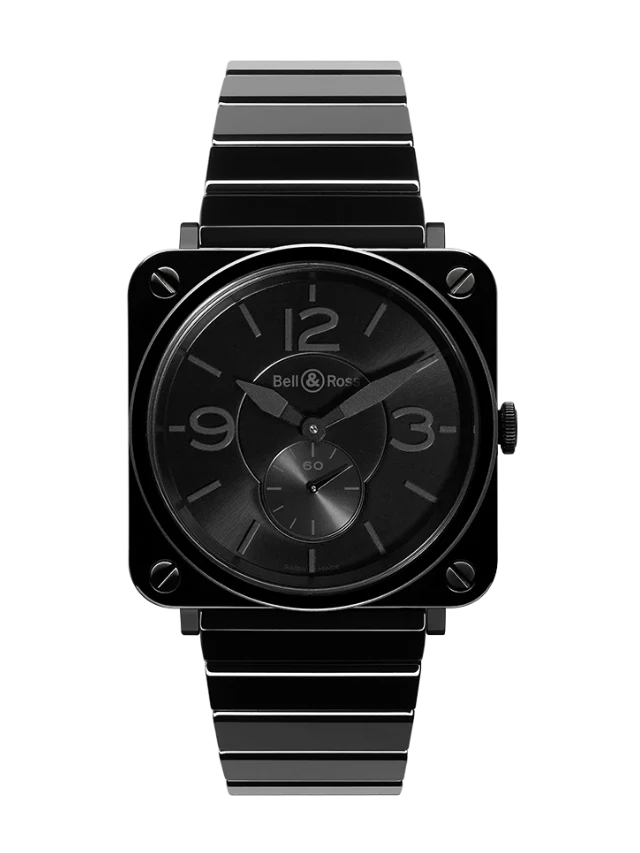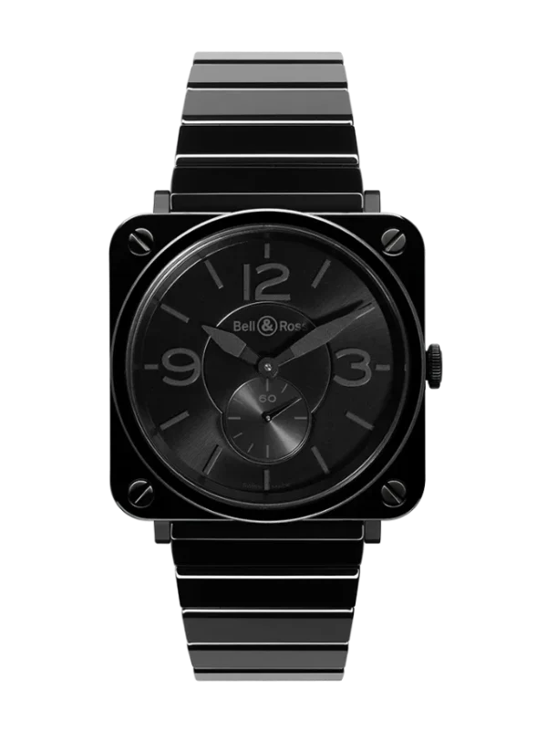 The Bell & Ross BR-S Black Ceramic Phantom (Ref. BRS-BLC-PH/SCE) features a compact 39 mm square case crafted from black ceramic, offering a lightweight, highly resistant, and modern stealth-inspired design. Its monochromatic black “Phantom” dial emphasizes minimalism and legibility, with subtle tone-on-tone hour markers and hands enhanced with Super-LumiNova® for low-light visibility. Powered by a precise quartz movement, the watch delivers reliable timekeeping in a slim and refined profile. A scratch-resistant sapphire crystal protects the dial, while water resistance and a matching black ceramic bracelet complete its durable construction, making it a distinctive blend of aviation-inspired design and contemporary elegance.
