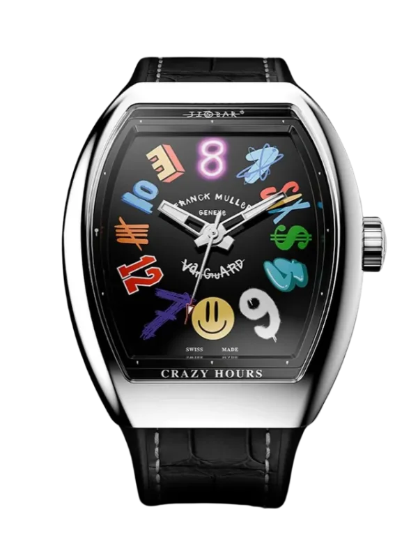Franck Muller Crazy Hours Automatic watch showcases a polished tonneau-shaped stainless steel case paired with a black dial featuring the iconic Crazy Hours design, where oversized, multicoloured Arabic numerals are arranged in a playful, non-sequential layout. The dial is accented with central hour and minute hands, a seconds hand, and subtle branding details, creating a bold and artistic visual appeal. Powered by an automatic movement, the watch is finished with a black leather strap and classic pin buckle, making it a distinctive luxury timepiece that blends creativity with fine watchmaking.