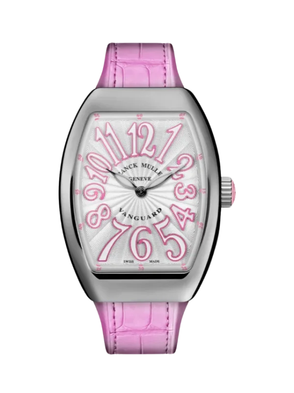 The Franck Muller Vanguard V 32 QZ (RS) showcases a compact and elegant 32 mm stainless steel tonneau-shaped case paired with a silver dial featuring the brand’s signature oversized Arabic numerals in a soft pink tone. Driven by a quartz movement, the dial presents central hour and minute hands within the distinctive Vanguard design. The watch is finished with a pink alligator leather strap, perfectly complementing the dial accents and offering a refined yet playful aesthetic, making it an ideal choice for those who appreciate bold design in a feminine and sophisticated form.