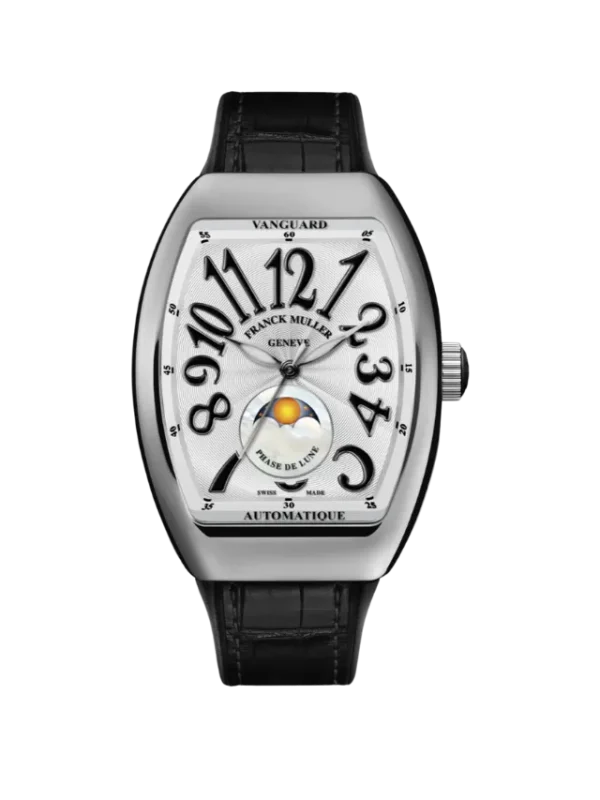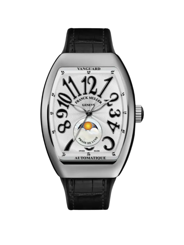 The Franck Muller Vanguard Automatic (SKU: V 35 SC AT FO L (NR)) features a refined 35 mm tonneau-shaped case paired with a distinctive white dial showcasing bold, stylised Arabic numerals and a moonphase display positioned at 6 o’clock. Powered by an automatic movement, the dial layout delivers a balanced blend of elegance and character. The watch is completed with a black alligator leather strap that enhances its luxury appeal while maintaining a classic, comfortable fit, making it a sophisticated choice for everyday wear or special occasions.
