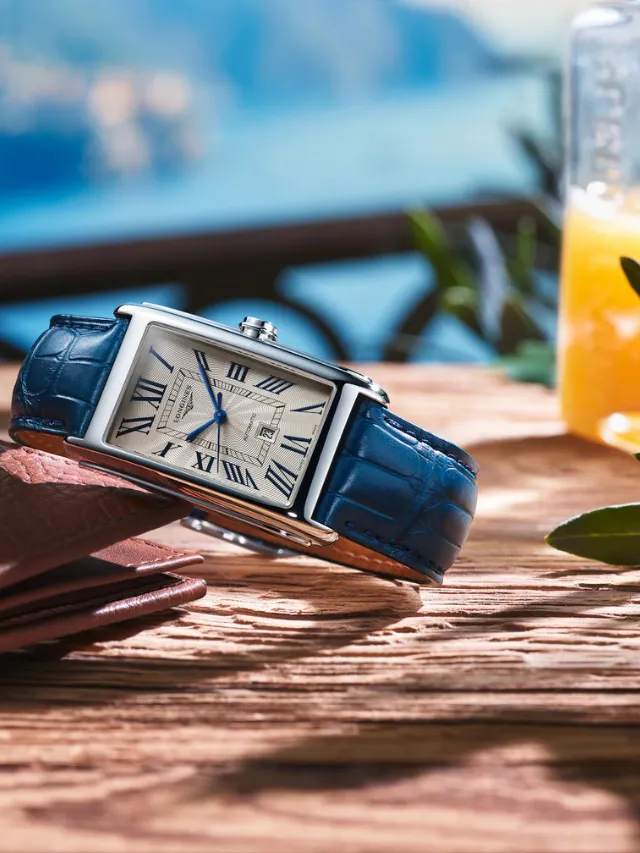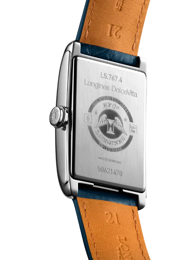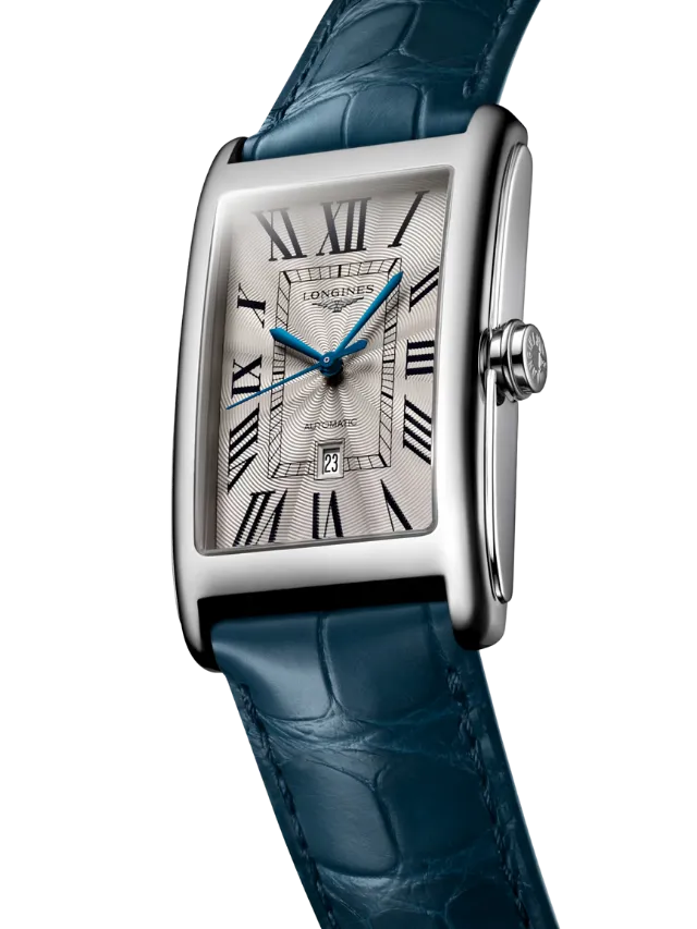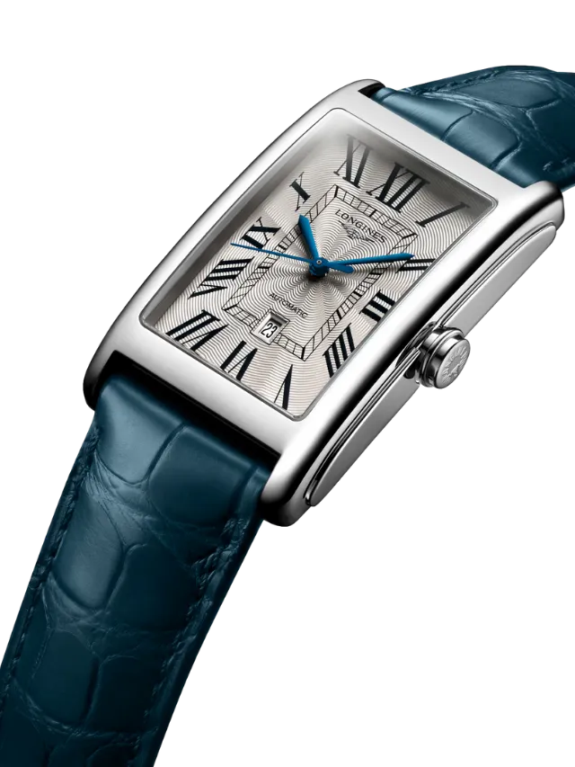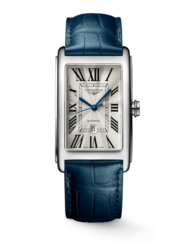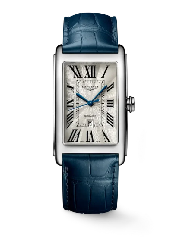 Longines DolceVita (L5.767.4.71.9) – Elegant and timeless, this refined rectangular timepiece features a classic silver-toned dial adorned with black Roman numeral hour markers and contrasting blue hands, creating a sophisticated and easily readable display. The polished stainless-steel case enhances the watch’s graceful proportions, while a subtle date window adds everyday practicality. Finished with a refined blue leather strap, this watch perfectly captures the understated elegance and urban charm of the DolceVita collection, making it ideal for both formal occasions and stylish daily wear.