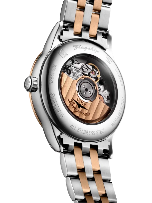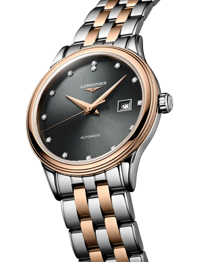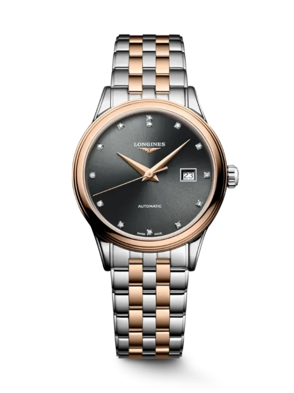 The Longines Flagship Classic L4.374.3.77.7 features an elegant round stainless steel case accented with rose-gold-tone detailing, paired with a refined grey dial set with diamond hour markers and a discreet date window at 3 o’clock. Powered by an automatic movement, the dial is complemented by slim rose-gold-tone hands that enhance its classic aesthetic. The watch is completed with a two-tone stainless steel and rose-gold-tone bracelet, offering a perfect balance of sophistication and everyday wearability, making it an ideal choice for those who appreciate timeless Swiss watchmaking with a touch of luxury.
