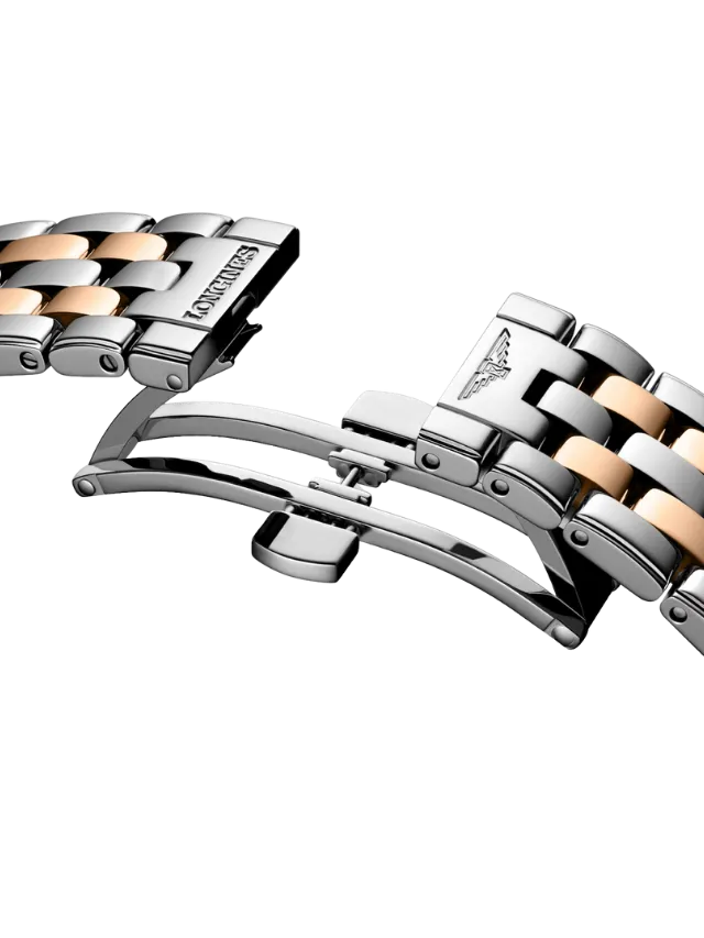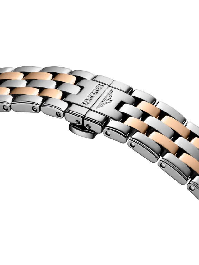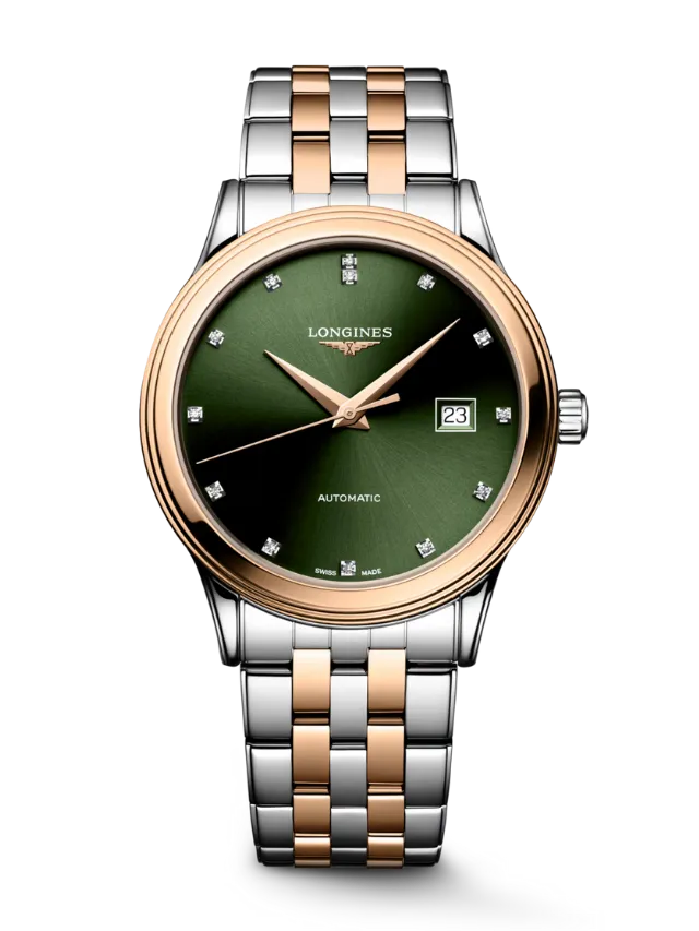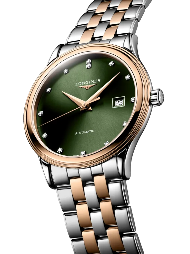 The Longines Elegance L4.984.3.07.7 showcases a refined round stainless steel case with rose-gold-tone bezel accents, paired with a rich green sunray dial that features diamond hour markers and a date window at 3 o’clock. The dial is signed “Automatic” and complemented by slim rose-gold-tone hands, giving the watch a balanced and elegant appearance. Finished with a two-tone stainless steel and rose-gold-tone bracelet, this timepiece reflects Longines’ timeless design language and classic Swiss elegance, making it suitable for both formal and everyday wear.