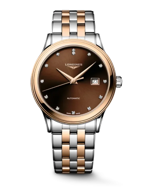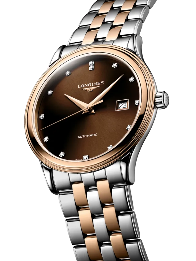 Longines Flagship Classic (L4.984.3.08.7) – A refined expression of timeless sophistication, this elegant timepiece features a rich brown sunray dial adorned with delicate diamond hour markers and slim hands that enhance its luxurious character. The polished case is framed with a warm rose-gold-tone bezel, perfectly complementing the dial’s deep hue. Finished with a graceful two-tone stainless-steel and rose-gold bracelet, the watch offers both comfort and refined style. A discreet date display at 3 o’clock adds everyday practicality, making this piece ideal for formal occasions and elegant daily wear.
