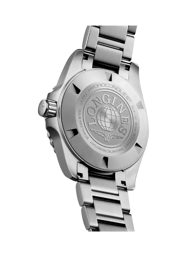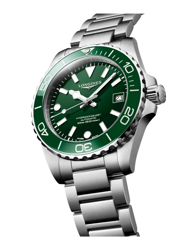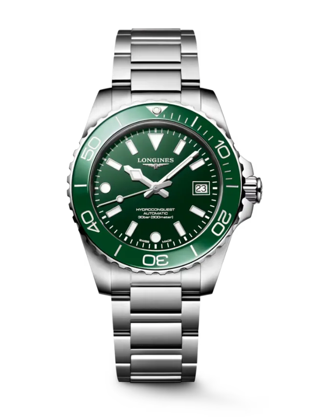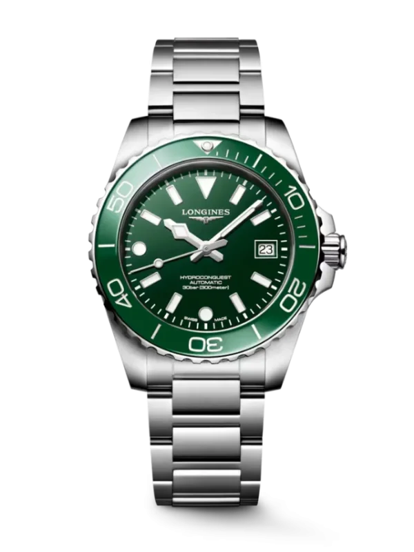 The Longines HydroConquest L3.779.4.06.6 features a versatile 41 mm stainless steel case paired with a green ceramic unidirectional rotating bezel and a matching green dial that delivers a bold yet refined sporty aesthetic. The dial is fitted with applied hour markers and hands filled with Swiss Super-LumiNova® for excellent readability in low-light conditions, along with a date display at 3 o’clock for everyday convenience. Powered by the Longines automatic calibre L888 with a silicon balance spring, the watch offers reliable precision and a power reserve of up to 72 hours. Built for durability and performance, it includes a screw-in crown, screw-down case back, scratch-resistant sapphire crystal with anti-reflective coating, and water resistance up to 300 meters, while the stainless steel bracelet with a secure folding clasp ensures comfort and reliability for both diving and daily wear.