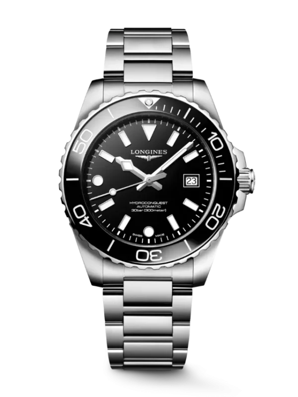 The Longines HydroConquest L3.788.4.56.6 features a robust 42 mm stainless steel case paired with a black ceramic unidirectional rotating bezel and a black sunray dial designed for maximum clarity and performance. The dial is equipped with applied hour markers and hands filled with Swiss Super-LumiNova® for excellent legibility in low-light conditions, along with a date display at 3 o’clock for everyday convenience. Powered by the Longines automatic calibre L888 with a silicon balance spring, the watch delivers reliable precision and a power reserve of up to 72 hours. Built for diving and active use, it includes a screw-in crown, screw-down case back, scratch-resistant sapphire crystal with anti-reflective coating, and water resistance up to 300 meters, while the stainless steel bracelet with a secure folding clasp ensures durability and comfort for daily wear.