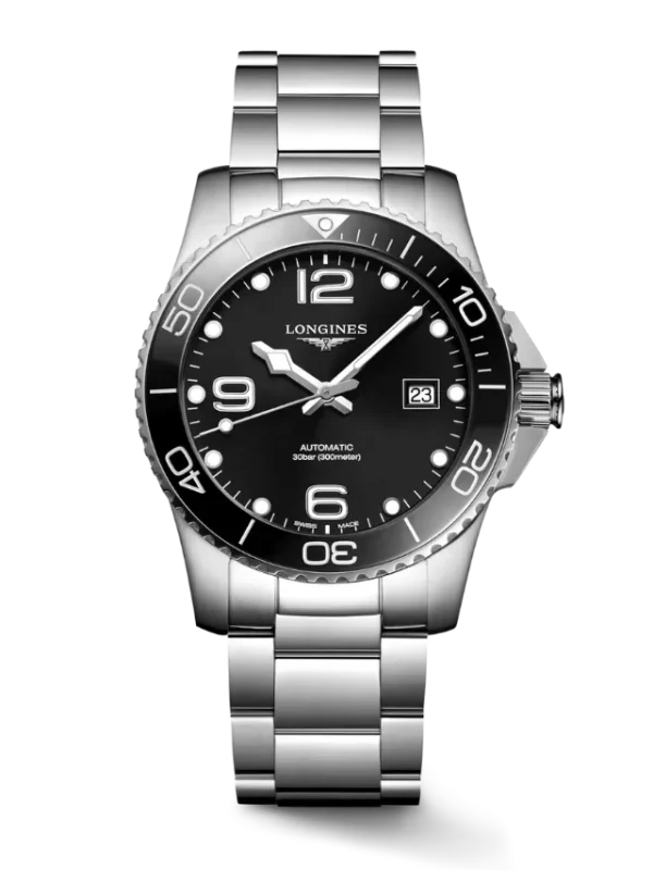 Automatic watch, Ø 41.00 mm, stainless steel and ceramic bezel, L3.781.4.56.6 Date, self-winding mechanical movement beating at 25’200 vibrations per hour, with a power reserve up to 72 hours.Screw-in crown unidirectional rotating bezel, water-resistant to 30 bar, scratch-resistant sapphire crystal, with several layers of anti-reflective coating on both sides.Sunray black dial, swiss super-luminova®.Stainless steel bracelet, with double safety folding clasp.