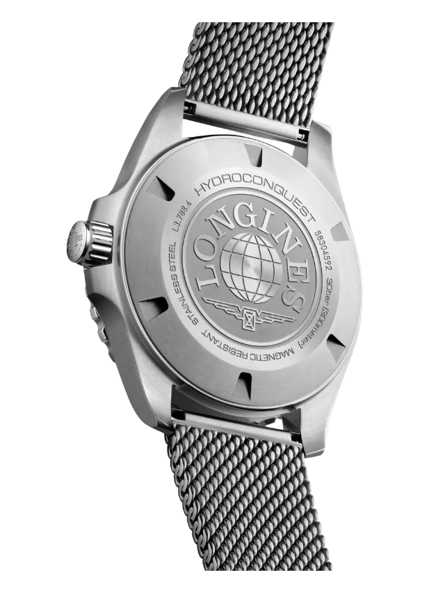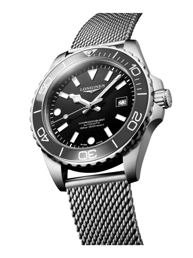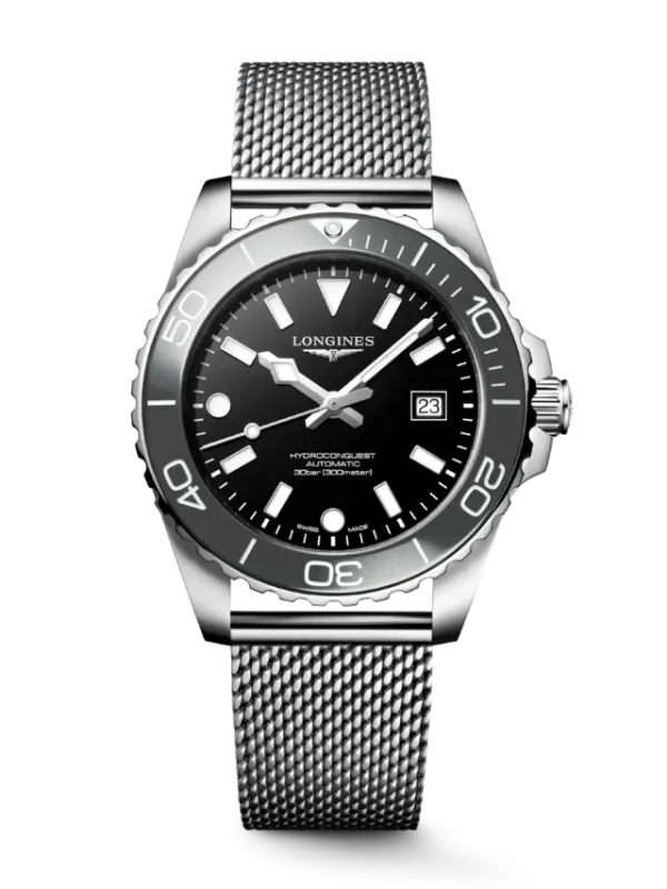 The Longines HydroConquest L3.788.4.70.6 features a robust 42 mm stainless steel case paired with a grey ceramic unidirectional rotating bezel and a black dial that delivers a modern and sporty aesthetic. The dial is equipped with applied hour markers and hands filled with Swiss Super-LumiNova® for excellent readability in low-light conditions, along with a date display at 3 o’clock for everyday convenience. Powered by the Longines automatic calibre L888 with a silicon balance spring, the watch offers reliable precision and a power reserve of up to 72 hours. Built for performance, it includes a screw-in crown, screw-down case back, scratch-resistant sapphire crystal with anti-reflective coating, and water resistance up to 300 meters, while the stainless steel mesh bracelet with a secure folding clasp ensures durability and comfort, making it ideal for both diving and daily wear.