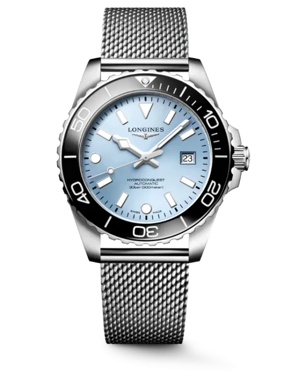 The Longines HydroConquest L3.788.4.99.6 features a robust 42 mm stainless steel case paired with a black ceramic unidirectional rotating bezel and a distinctive light blue dial that enhances its sporty yet refined character. The dial is fitted with applied hour markers and hands filled with Swiss Super-LumiNova® for excellent visibility in low-light conditions, along with a date display at 3 o’clock for everyday practicality. Powered by the Longines automatic calibre L888 with a silicon balance spring, the watch offers precise timekeeping and a power reserve of up to 72 hours. Built for performance, it includes a screw-in crown, screw-down case back, scratch-resistant sapphire crystal with anti-reflective coating, and water resistance up to 300 meters, while the stainless steel mesh bracelet with a secure folding clasp ensures both durability and comfort, making it ideal for diving and daily wear.