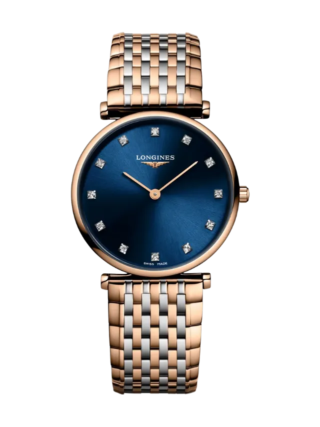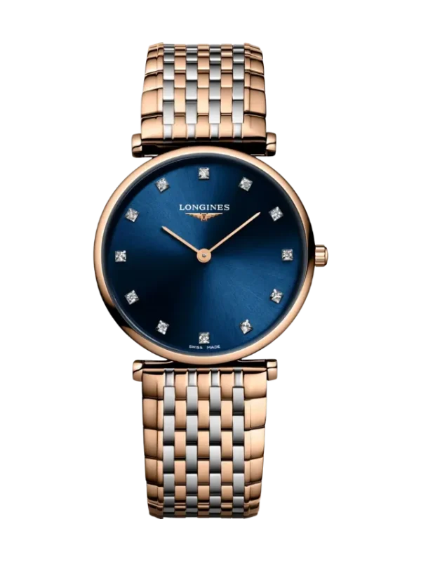 La Grande Classique de Longines (L4.866.1.98.7) – A graceful embodiment of timeless elegance, this ultra-slim timepiece features a deep blue sunray dial adorned with delicate diamond hour markers, creating a refined and luxurious visual appeal. The slim round case is enhanced with a warm rose-gold-tone finish, perfectly complementing the dial’s rich tone. Completed with an elegant two-tone stainless-steel and rose-gold bracelet, the watch sits beautifully on the wrist, making it an ideal choice for formal occasions as well as sophisticated everyday wear. La Grande Classique de Longines reflects the brand’s dedication to understated luxury, precision, and enduring style.