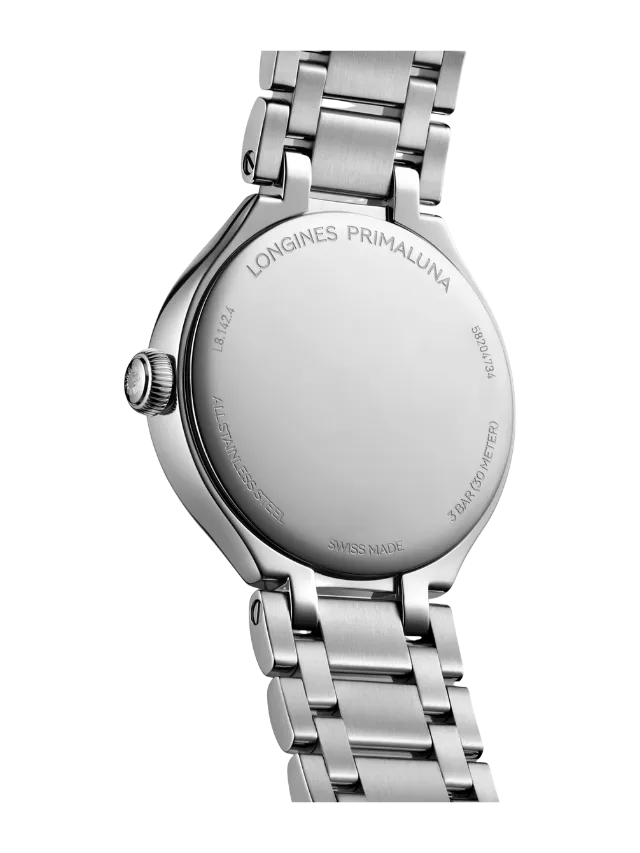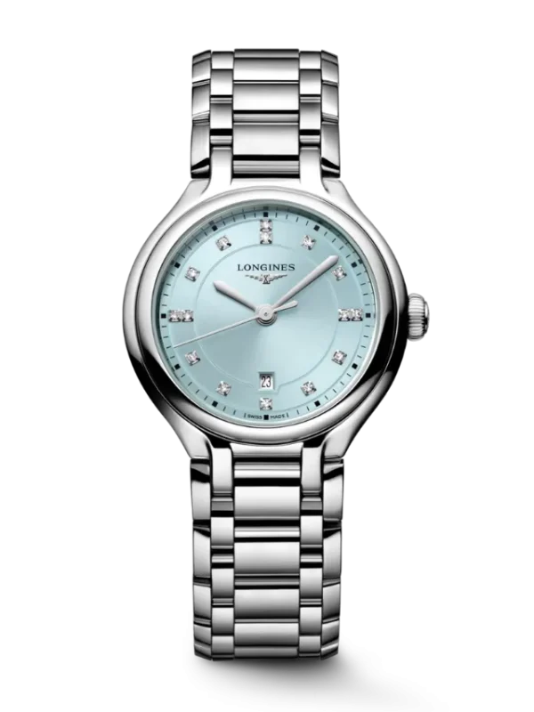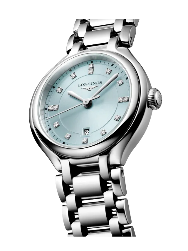 The Longines PrimaLuna L8.142.4.97.6 is an elegant ladies’ timepiece crafted with a refined 30 mm stainless steel case and matching stainless steel bracelet that highlight the graceful curves of the PrimaLuna collection. The watch features a mint-blue sunray dial adorned with diamond hour markers and polished hands, complemented by a date display at 6 o’clock for everyday practicality. A scratch-resistant sapphire crystal with multiple layers of anti-reflective coating protects the dial, while the precise Swiss quartz movement ensures reliable timekeeping. Water-resistant to 3 bar and secured with a triple safety folding clasp with push-button opening mechanism, this sophisticated watch combines timeless elegance with dependable Swiss craftsmanship.194,000