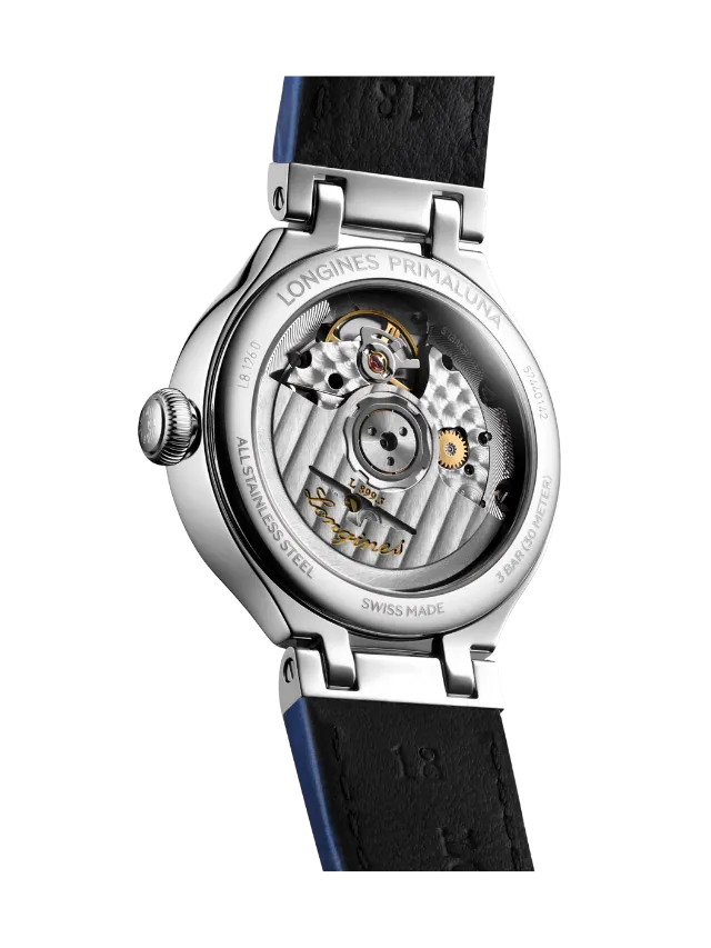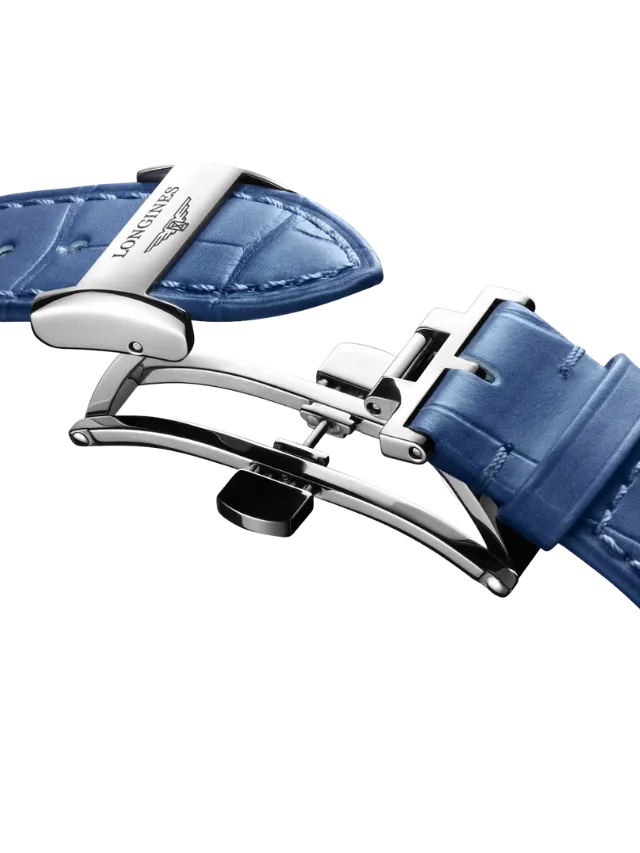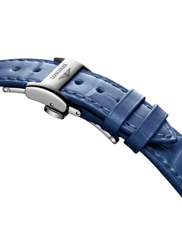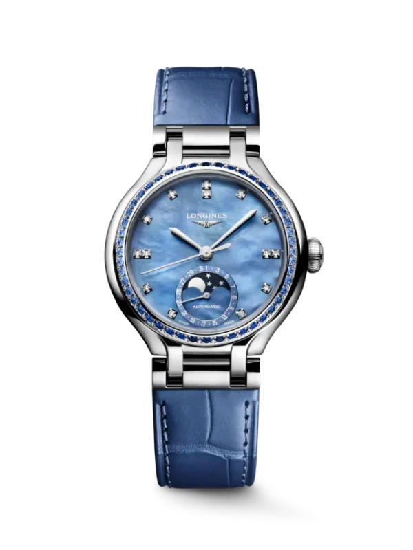 Longines PrimaLuna (L8.126.0.97.2) – Elegant and poetic in design, this refined timepiece features a beautifully textured Blue mother-of-pearl dial adorned with diamond hour markers, creating a graceful and luxurious appearance. A charming moonphase display at 6 o’clock adds depth and visual harmony to the dial. The polished stainless-steel case is framed by a delicate diamond-set bezel, enhancing its feminine sophistication. Completed with a matching blue leather strap, this watch offers both comfort and elegance, making it an ideal choice for refined everyday wear or special occasions