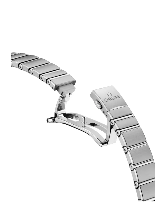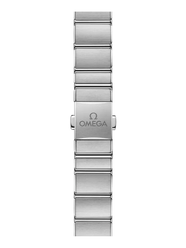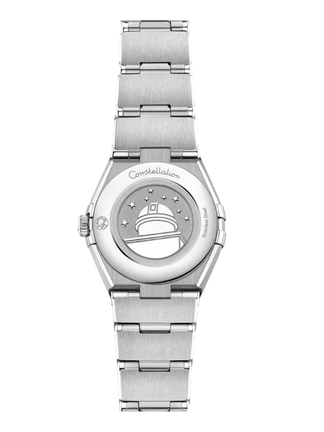 This 25 mm stainless steel model features a bezel engraved with Roman numerals, white mother-of-pearl dial with diamond hour markers and scratch-resistant saphire crystal. The hands, OMEGA logo, Constellation star and diamond holders are in 18K white gold.