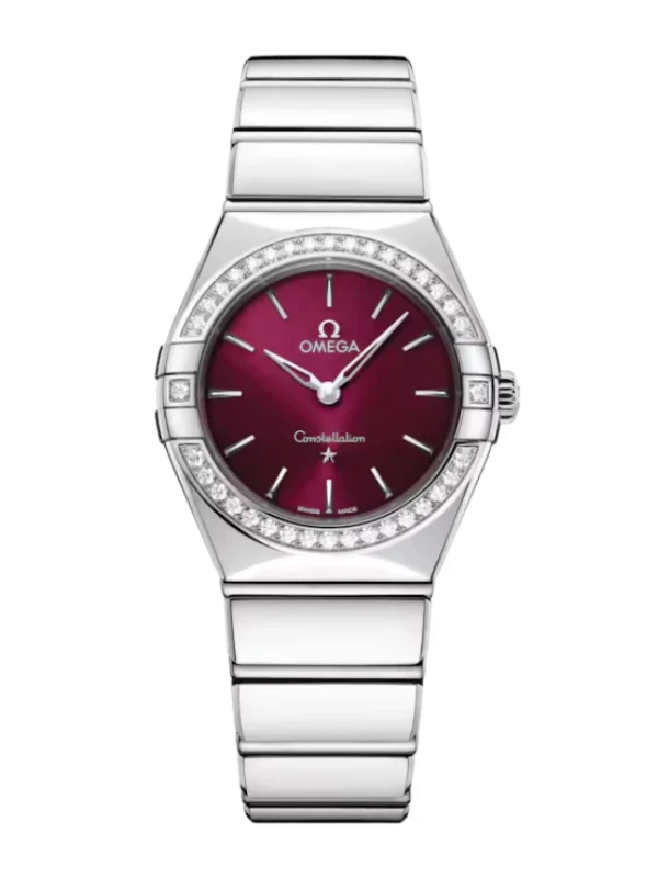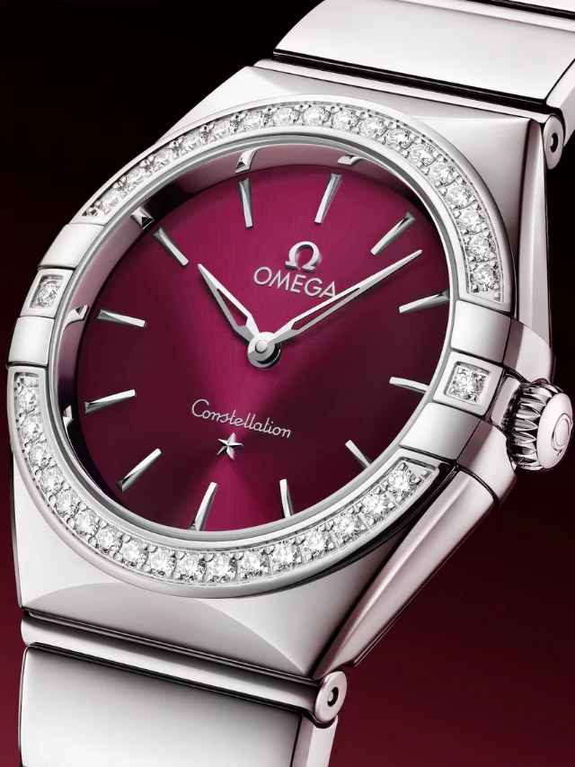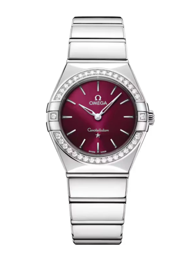 This 28 mm model is crafted in stainless steel and features a radiant diamond-paved bezel. The sun-brushed burgundy dial has been given a tinted lacquer finish, while other details include polished and skeletonized 18K white Gold hands and star at six o’clock, and hour markers in polished 18K white Gold.