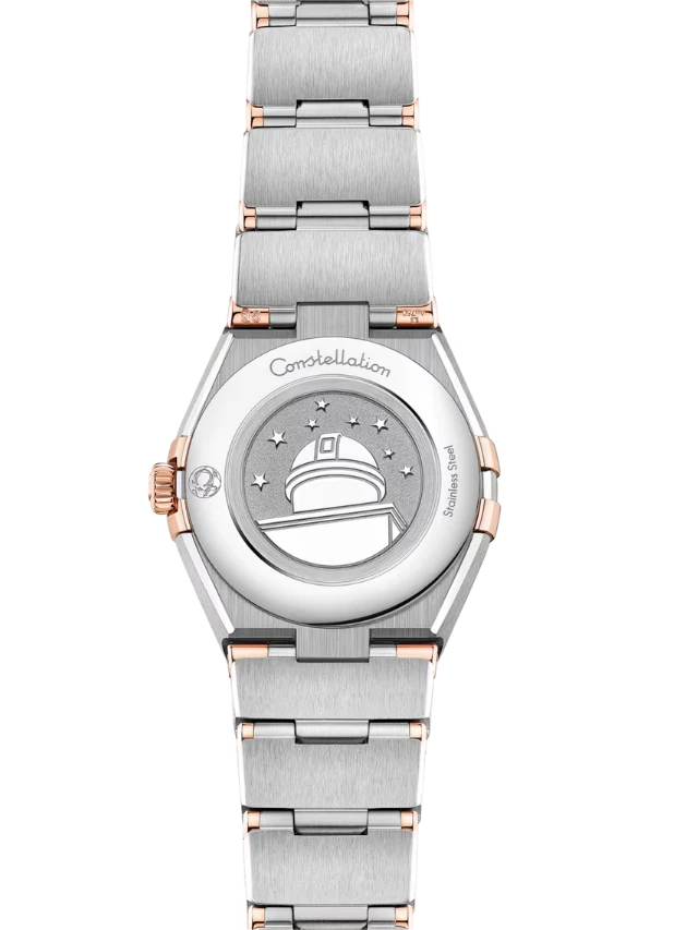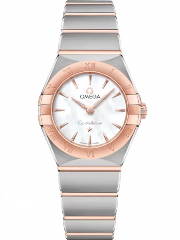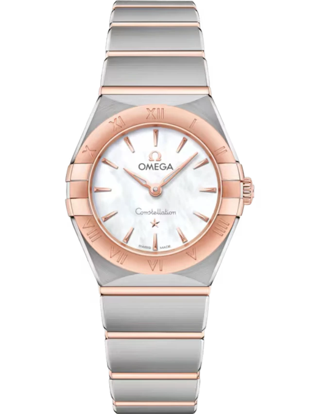 This 25 mm 18K Sedna™ gold and stainless model features a bezel engraved with Roman numerals, white mother-of-pearl dial and scratch-resistant saphire crystal. The hands, OMEGA logo, Constellation star and indexes are also in 18K Sedna™ gold.