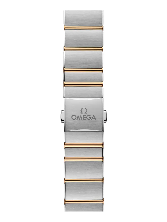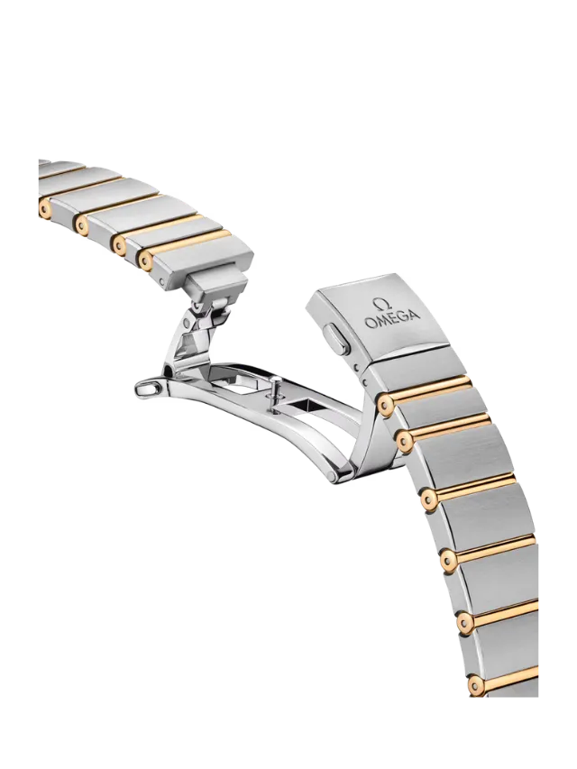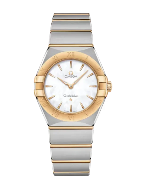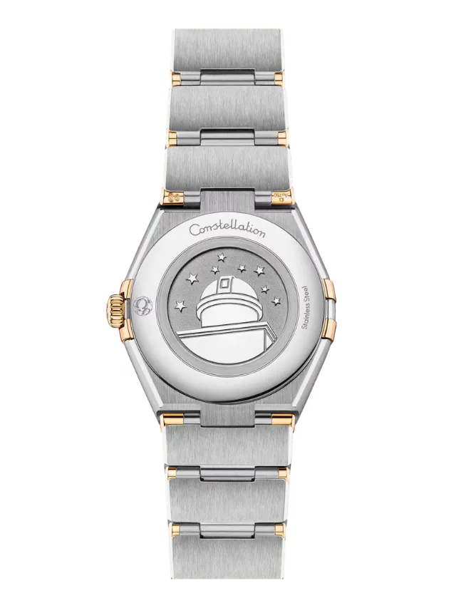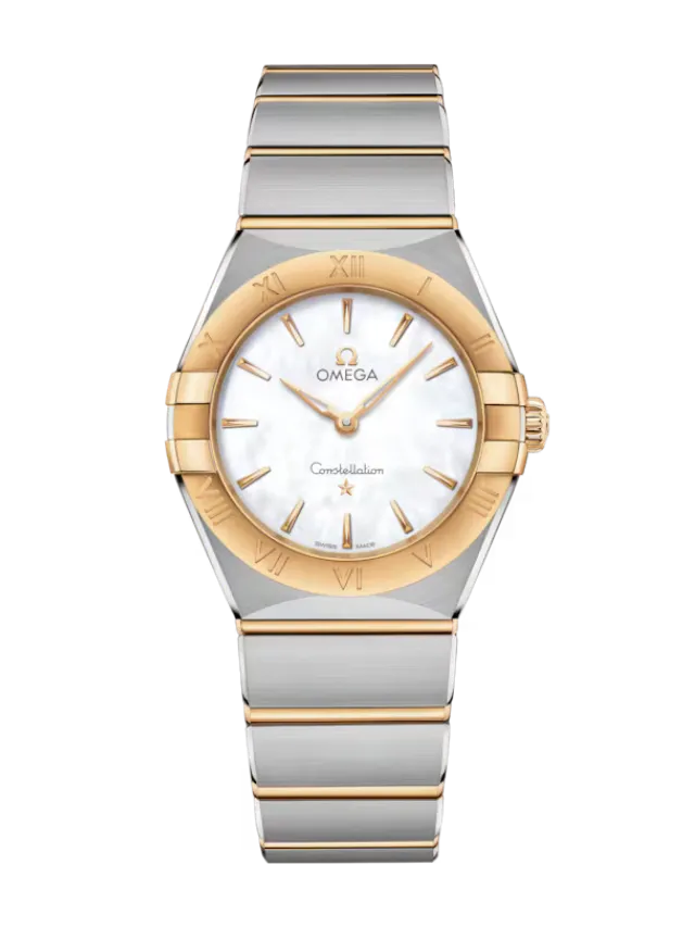 This 28 mm 18K yellow gold and stainless steel model features a bezel engraved with Roman numerals, white mother-of-pearl dial and scratch-resistant sapphire crystal. The hands, OMEGA logo, Constellation star and indexes are also in 18K yellow gold.
