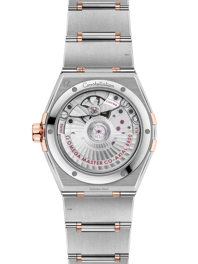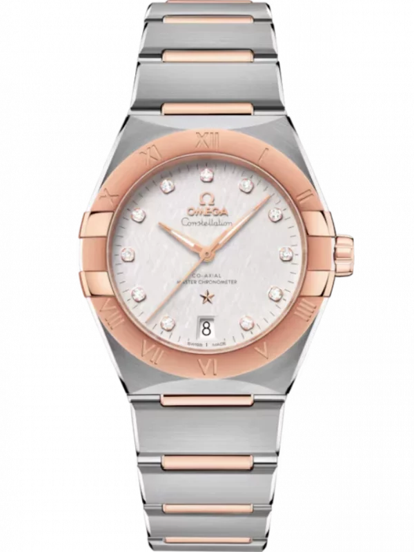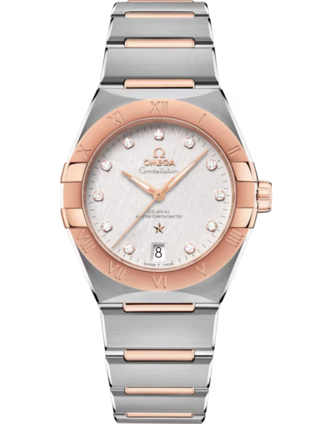This 36 mm stainless steel and 18K Sedna™ gold model features a bezel engraved with Roman numerals, a silk-embossed creamy silvery dial with diamond indexes and a date window at the 6 o’clock position. The hands, OMEGA logo, Constellation star and diamond holders are all in 18K Sedna™ gold.