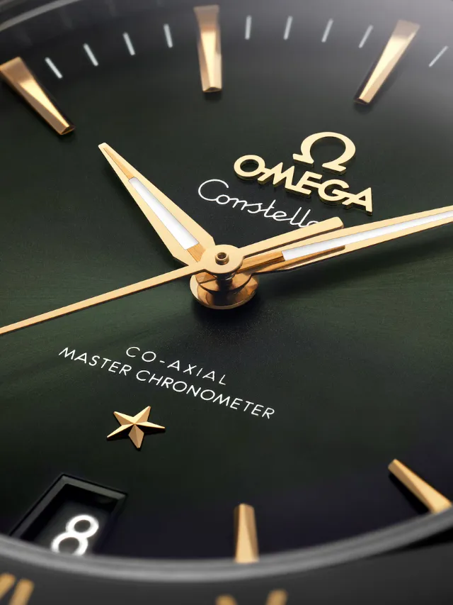 This 41 mm model, in stainless steel and 18K Yellow gold, features a black polished ceramic bezel ring with Roman numerals filled with OMEGA Ceragold™. It has a sun-brushed green dial with gradient effect and a date window at the 6 o’clock position. The hands, OMEGA logo, Constellation star and indexes are also in 18K Yellow gold.