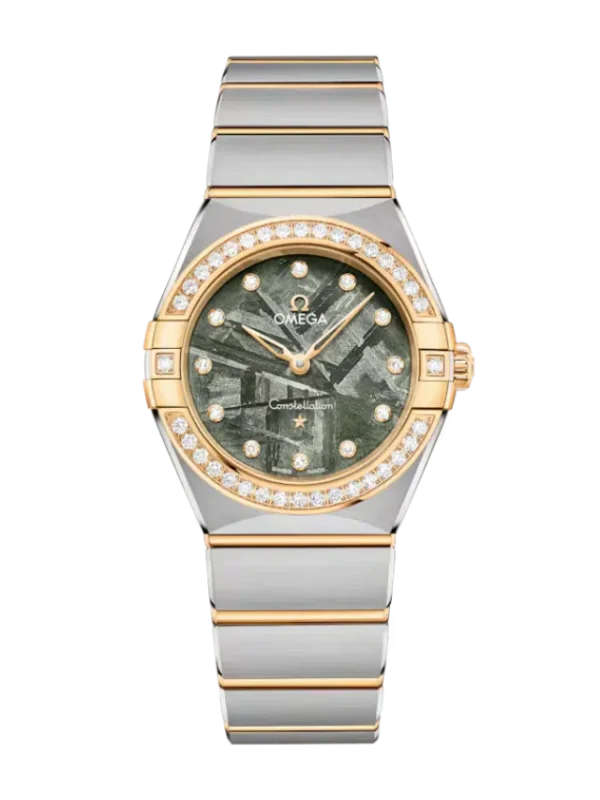 The astonishing dial is formed from a genuine piece of iron meteorite, which has been given a green colour treatment. The natural pattern within the meteorite is unique to each model, meaning that no two dials are ever the same. It is completed with diamond hour markers, and a Constellation star in 18K yellow gold.