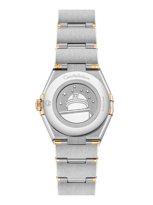 The 28 mm watch is presented with a case and mono-rang bracelet created from stainless steel and 18K yellow gold, with signature Constellation features including the polished claws, half-moon facets, and a diamond-paved bezel.