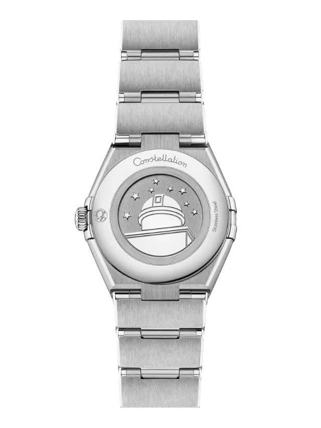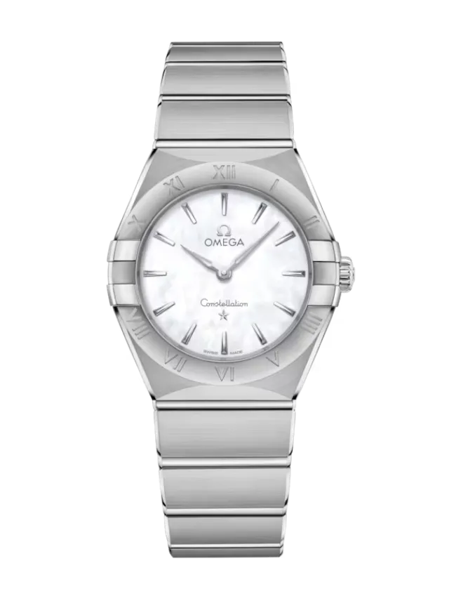This 28 mm stainless steel model features a bezel engraved with Roman numerals, white mother-of-pearl dial and scratch-resistant sapphire crystal. The hands, OMEGA logo, Constellation star and indexes are in 18K white gold.