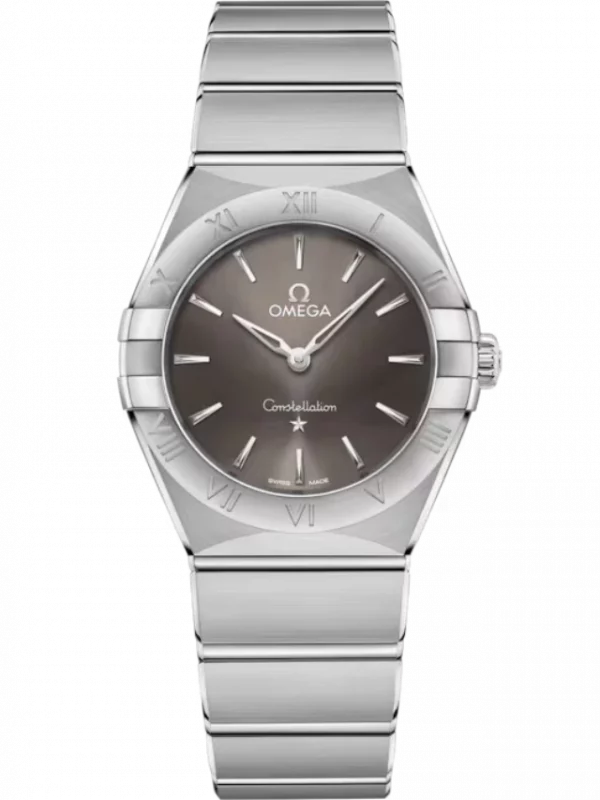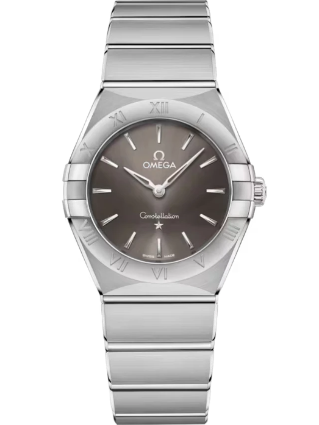 This 28 mm stainless steel model features a bezel engraved with Roman numerals, sun-brushed grey dial and scratch-resistant saphire crystal. The hands, OMEGA logo, Constellation star and indexes are in 18K white gold.