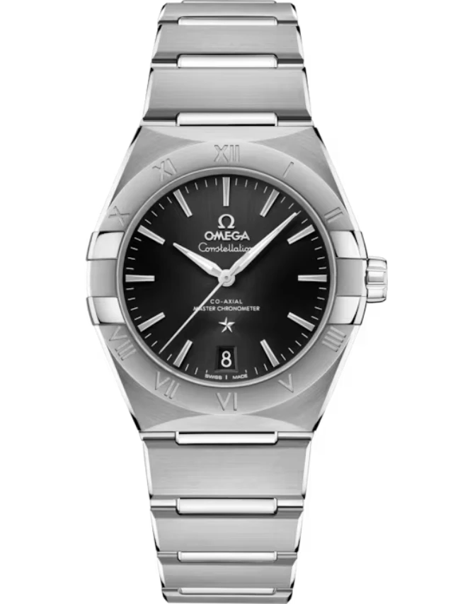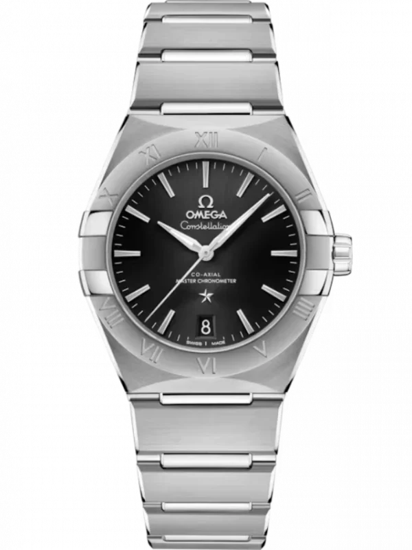 This 36 mm stainless steel model features a bezel engraved with Roman numerals, a sun-brushed black dial and a date window at the 6 o’clock position. The hands, OMEGA logo, Constellation star and indexes are all in 18K white gold.