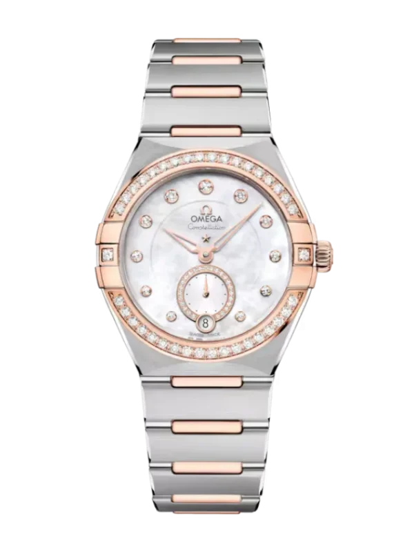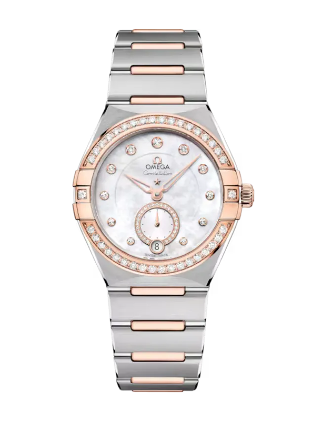 This 34 mm model in 18K Sedna™ gold and stainless steel features a diamond-paved bezel, white pearled mother-of-pearl dial, and a round date window at the 6 o’clock position. The incremental diamond hour markers are presented in 18K Sedna™ gold holders, while the Small Seconds subdial ring is also crafted in 18K Sedna™ gold and set with diamonds.