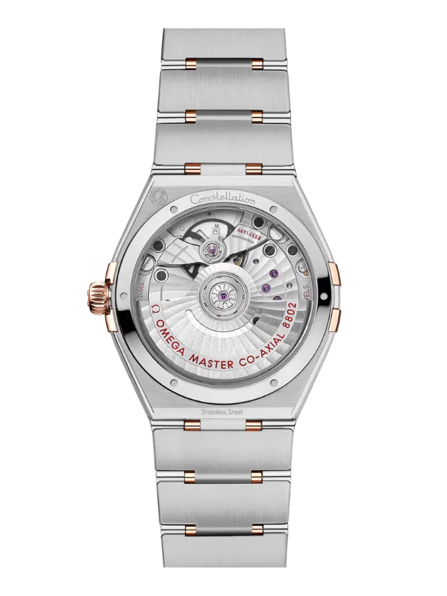 Presented on the iconic mono-rang bracelet with a butterfly clasp and easy comfort adjustment, the timepiece is driven by the OMEGA Co-Axial Master Chronometer Calibre 8802, visible through the domed scratch-resistant sapphire crystal.