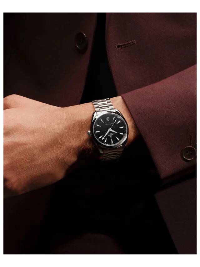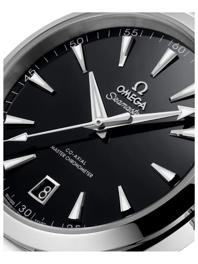 It has a lacquered black varnish dial with rhodium-plated diamond-polished OMEGA logo, and date window at 6 o’clock. The hands and hour markers, also rhodium-plated, are filled with white Super-LumiNova which emits a blue glow.