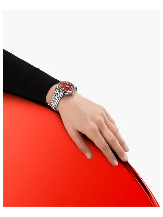 The terracotta dial, fashioned from brass, is lacquered and sun-brushed from the centre. There is a date window at 6 o’clock and rhodium-plated hands and indexes filled with white Super-LumiNova.