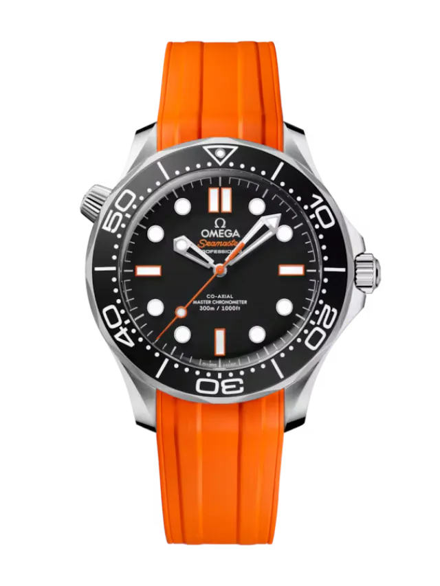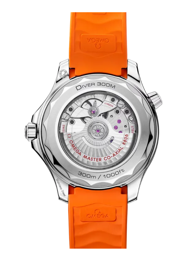 The watch is presented on an integrated orange rubber strap with foldover clasp, and is driven by the OMEGA Co-Axial Master Chronometer Calibre 8806, which can be seen through the sapphire crystal caseback.