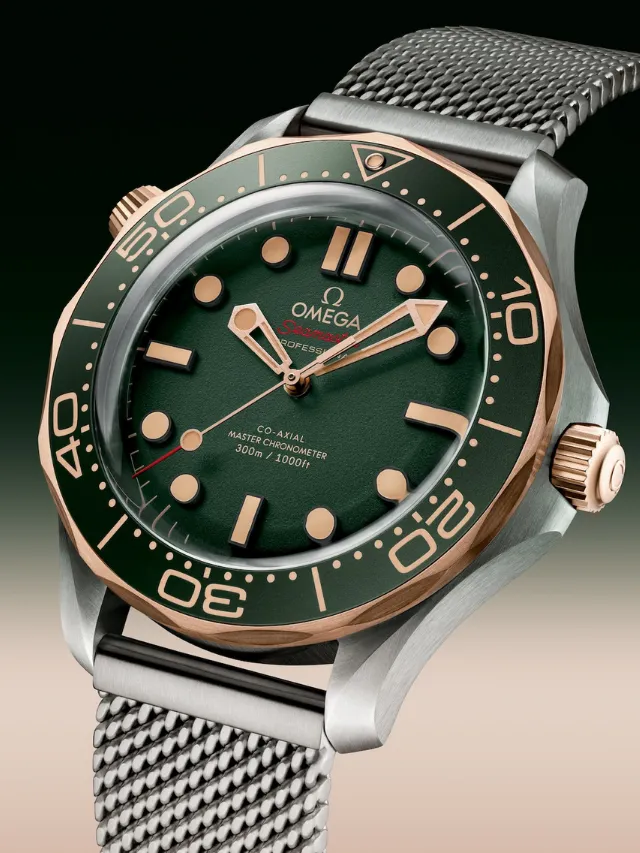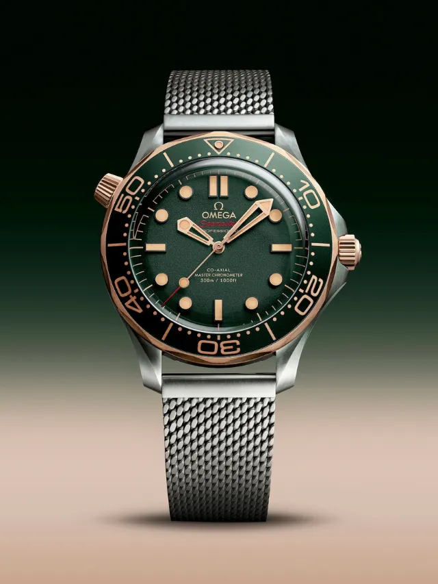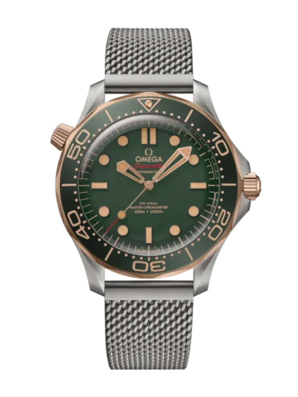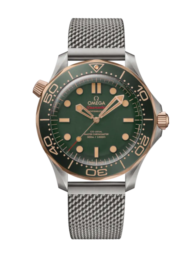 This 42 mm model is crafted in grade 2 titanium and OMEGA’s exclusive 9K Bronze Gold. It includes a green oxalic anodized aluminium bezel ring with a diving scale in vintage Super-LumiNova.