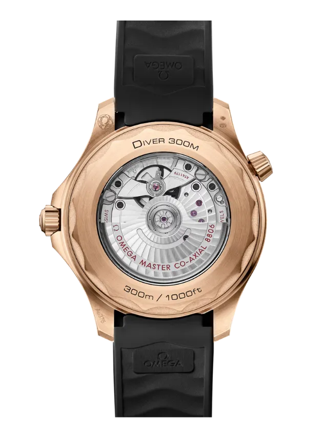 The watch is presented on an integrated black rubber strap with buckle, and is driven by the OMEGA Co-Axial Master Chronometer Calibre 8806, which can be seen through the sapphire-crystal caseback.