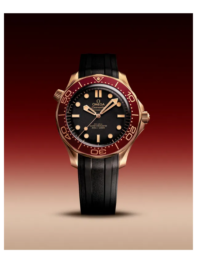 This 42 mm model is crafted in OMEGA’s exclusive Bronze Gold and includes a burgundy oxalic anodized aluminium bezel ring with a diving scale in vintage Super-LumiNova.