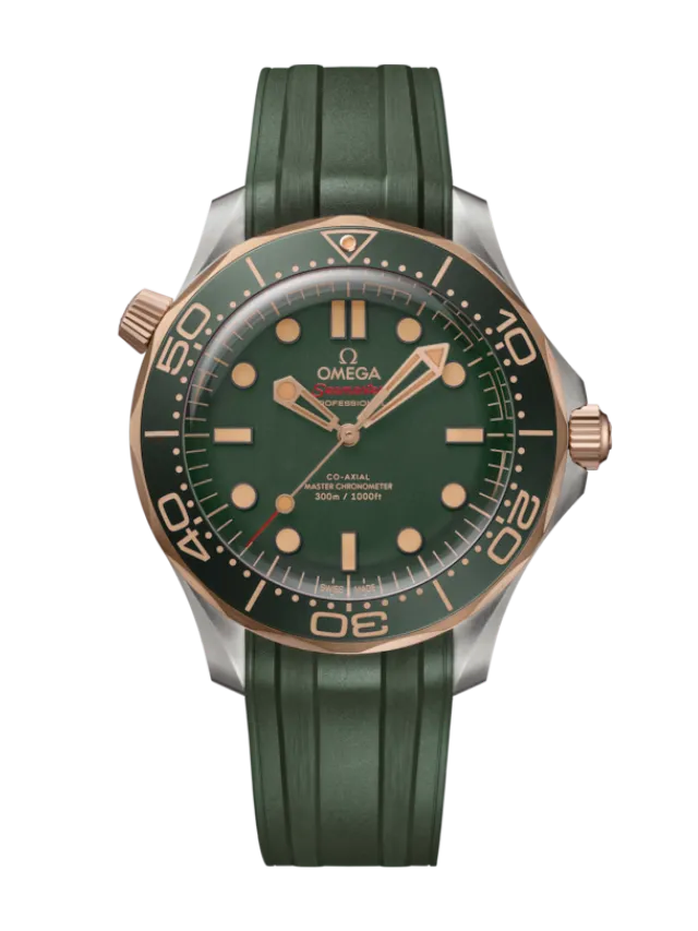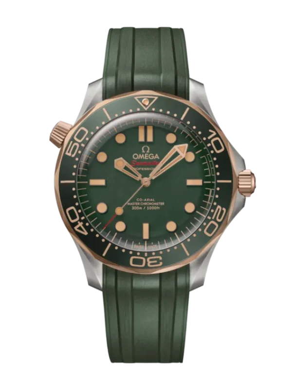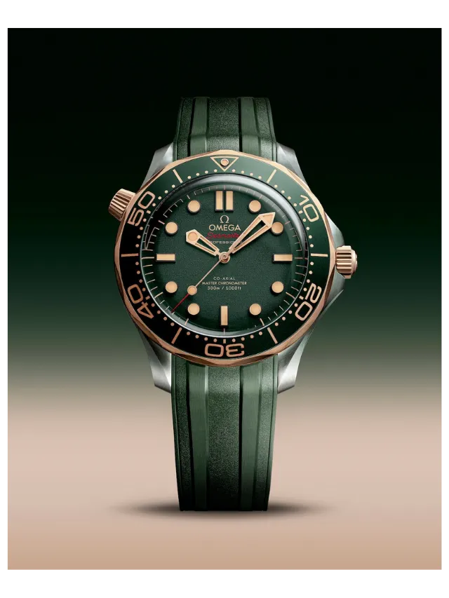 This 42 mm model is crafted in grade 2 titanium and OMEGA’s exclusive 9K Bronze Gold. It includes a green oxalic anodized aluminium bezel ring with a diving scale in vintage Super-LumiNova.