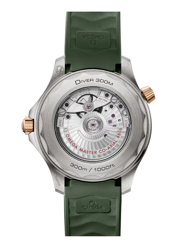 The watch is presented on an integrated green rubber strap with foldover clasp, and is driven by the OMEGA Co-Axial Master Chronometer Calibre 8806, which can be seen through the sapphire-crystal caseback.