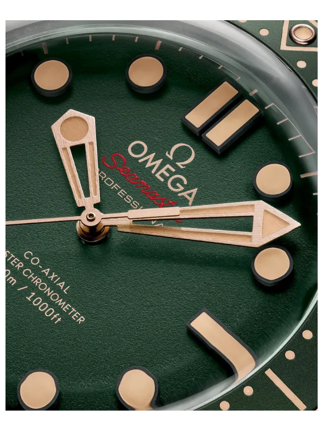 Sandblasted green aluminium is used to create the dial, which features PVD 18K Bronze Gold hands and blackened indexes, all filled with vintage Super-LumiNova. The other markings, including the OMEGA logo, are transferred in light brown and red.