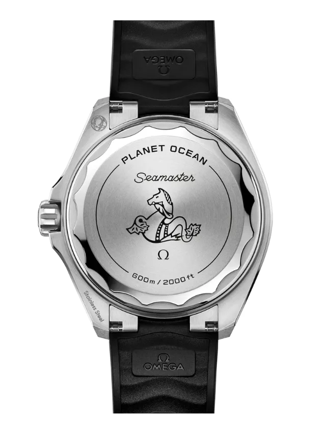 Powered by the Co-Axial Master Chronometer Calibre 8912, this Seamaster Planet Ocean is worn on a black rubber strap with a stainless steel link to the case and a foldover clasp. On the reverse side of the watch, the screw-in caseback is made from polished-brushed grade 5 titanium, and displays OMEGA’s famous seahorse emblem.